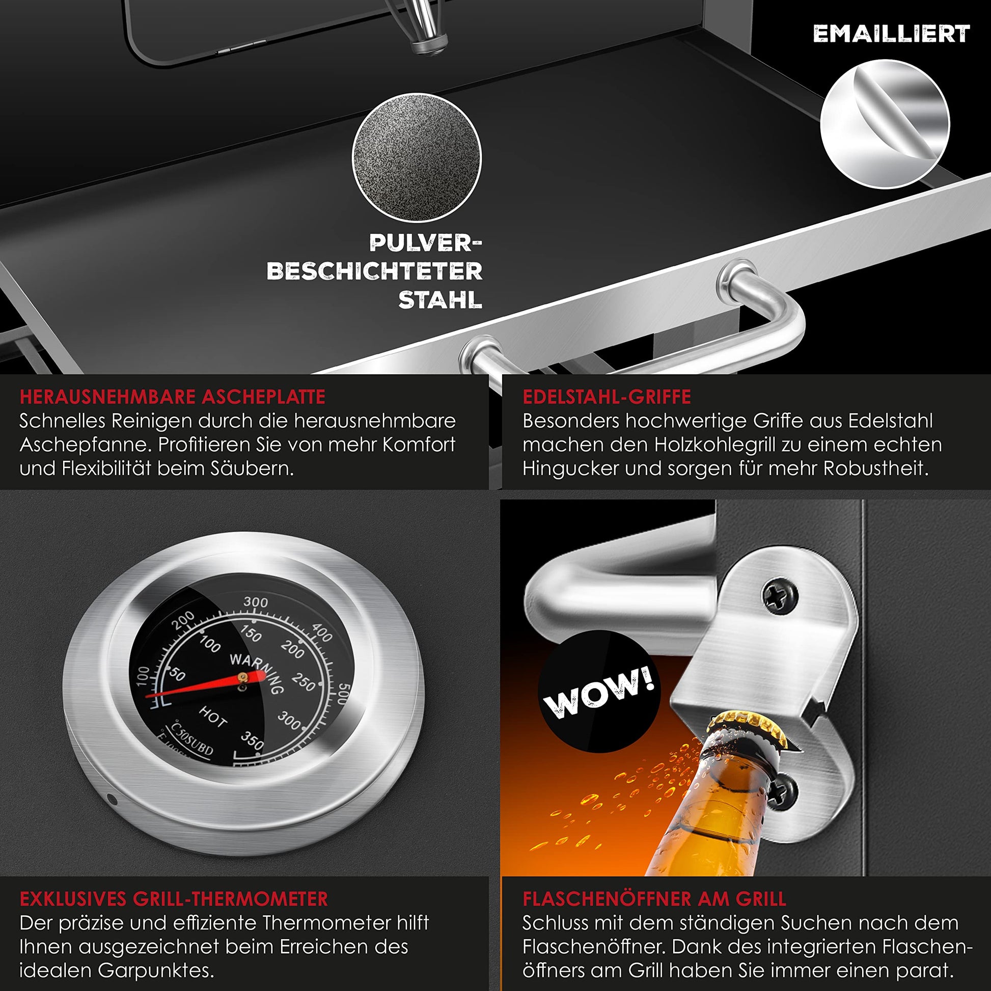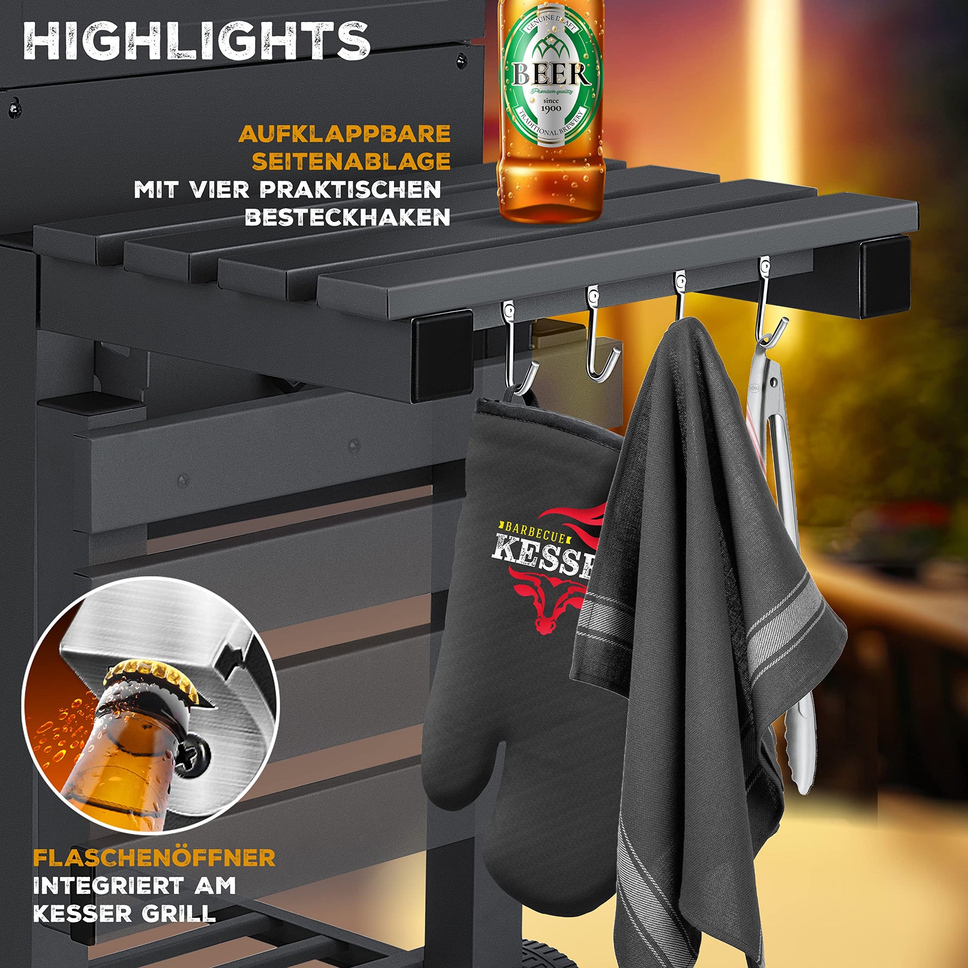 • 𝐀𝐂𝐂𝐄𝐒𝐎𝐑𝐈𝐎𝐒: el carro de la barbacoa de carbón de KESSER está equipado con un amplio espacio de almacenamiento para colocar los utensilios de la barbacoa, la comida de la barbacoa o los accesorios de la barbacoa, para que siempre tengas todo a tu alcance. Para que la fiesta de la barbacoa sea perfecta, también lleva integrado un abridor de botellas para una cerveza fría. Las pinzas y el cepillo de la parrilla se pueden colgar en los ganchos de los cubiertos.