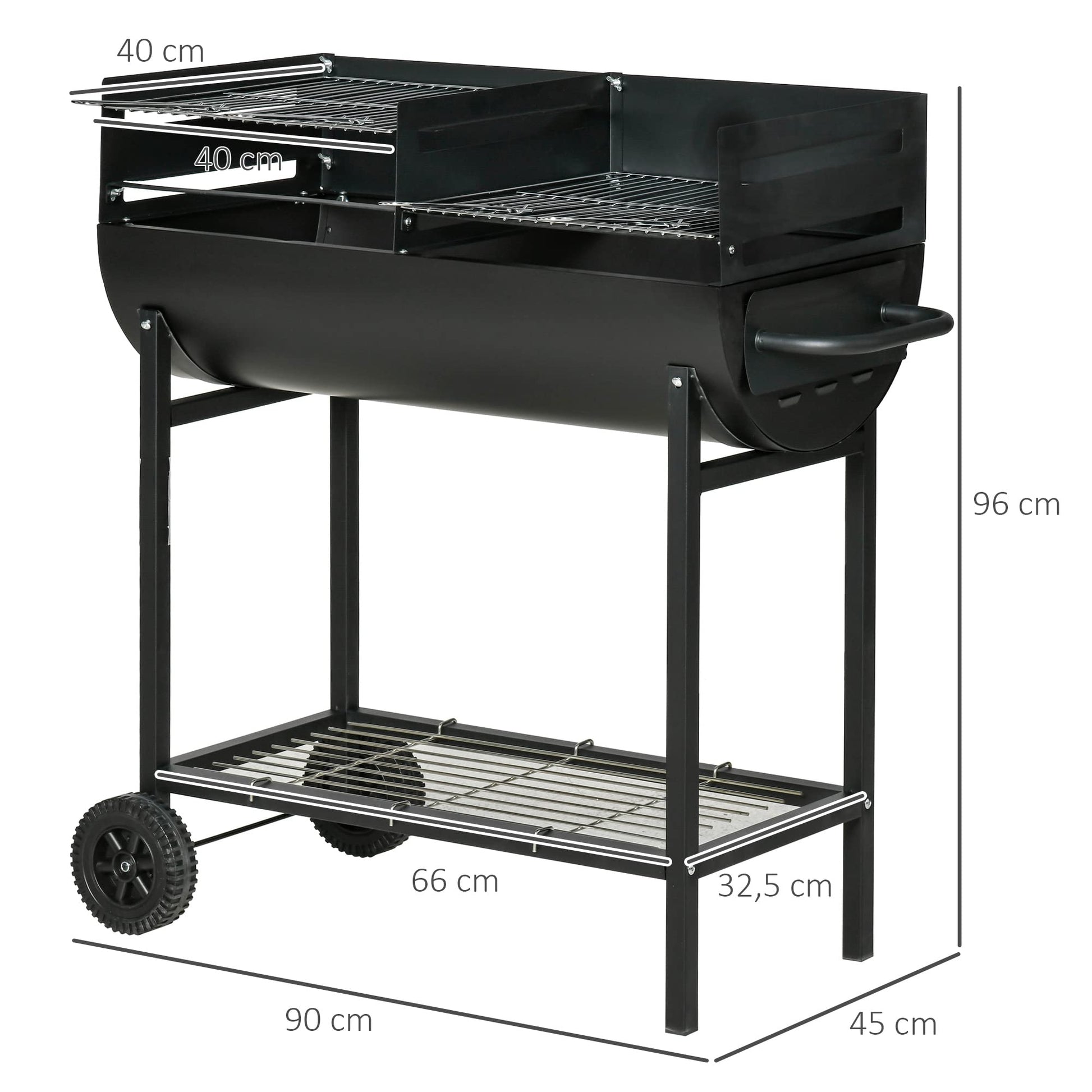 Outsunny Barbacoa Carbón Portátil 90x45cm, Parrilla Ajustable, Estante, Ruedas - Exterior Negro