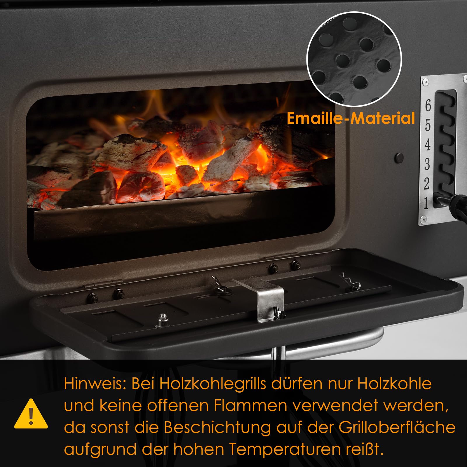 - 🔥Bandeja de carbón ajustable en altura: la altura de nuestra bandeja de carbón para parrilla de barbacoa se puede ajustar en 6 niveles, puede leer la temperatura de la cámara de cocción a través del termómetro en la tapa y luego ajustar la altura de la bandeja de carbón para ajustar la potencia de fuego.