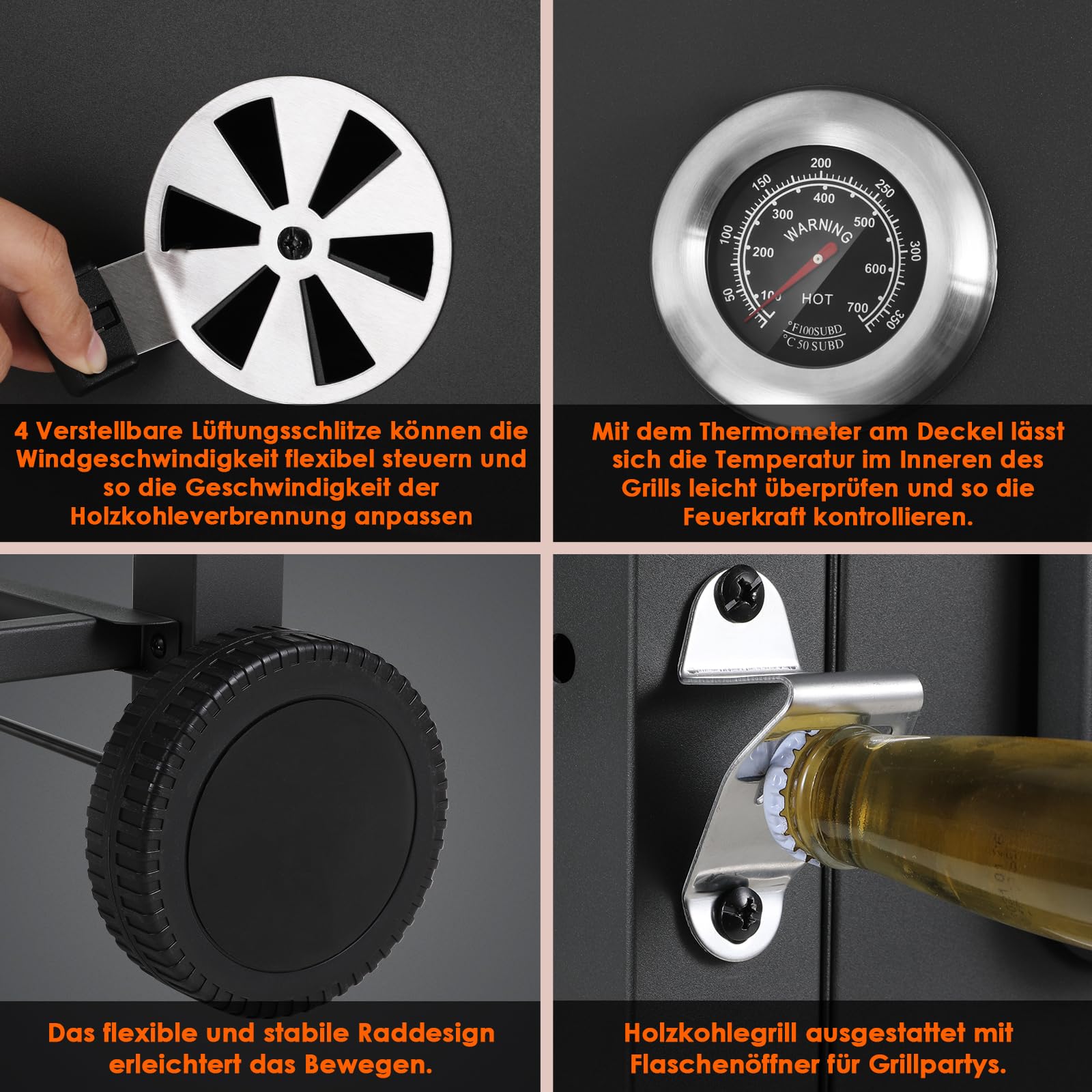- 🔥Fiesta de barbacoa: la parrilla con tapa está hecha de metal de alta calidad + proceso de pintura en aerosol a alta temperatura, que es resistente a altas temperaturas y corrosión y tiene una estructura estable y sólida. Configurar la parrilla es relativamente fácil y dos personas pueden hacerlo en 40 minutos. El carrito para parrilla al aire libre también tiene un abridor de botellas integrado para mayor comodidad en la fiesta y, por lo tanto, es perfecto para reuniones de barbacoa con familiares y amigos.